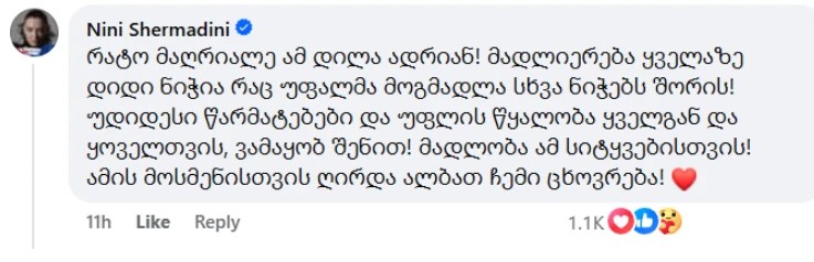 „რატო მაღრიალე ამ დილა ადრიან! მადლიერება ყველაზე დიდი ნიჭია რაც უფალმა მოგმადლა სხვა ნიჭებს შორის! უდიდესი წარმატებები და უფლის წყალობა ყველგან და ყოველთვის, ვამაყობ შენით! მადლობა ამ სიტყვებისთვის! ამის მოსმენისთვის ღირდა ალბათ ჩემი ცხოვრება!“, – წერს ნინი შერმადინი.