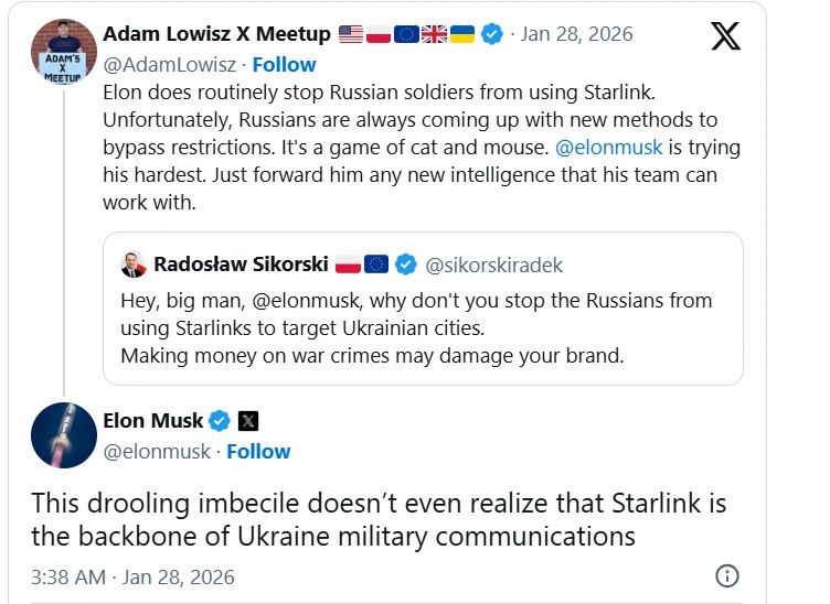 „ამ დორბლიან იდიოტს არც კი ესმის, რომ Starlink-ი უკრაინის სამხედრო კავშირის საფუძველს წარმოადგენს“, - უპასუხა მასკმა პოლონეთის საგარეო საქმეთა მინისტრს.