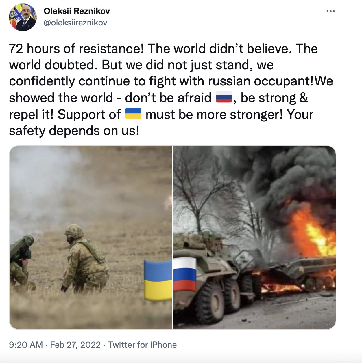„წინააღმდეგობის 72 საათი! მსოფლიომ არ დაიჯერა, მსოფლიო დაეჭვდა, მაგრამ ჩვენ არათუ ძალა შევინარჩუნეთ, არამედ თავდაჯერებულად ვაგრძელებთ რუსი ოკუპანტის წინააღმდეგ ბრძოლას! ჩვენ ვაჩვენეთ მსოფლიოს - ნუ შეგეშინდებათ რუსეთის, იყავით ძლიერნი და მოიგერიეთ ის. უკრაინის მხარდაჭერა უფრო ძლიერი უნდა იყოს! თქვენი უსაფრთხოება ჩვენზეა დამოკიდებული“, - წერს რეზნიკოვი.