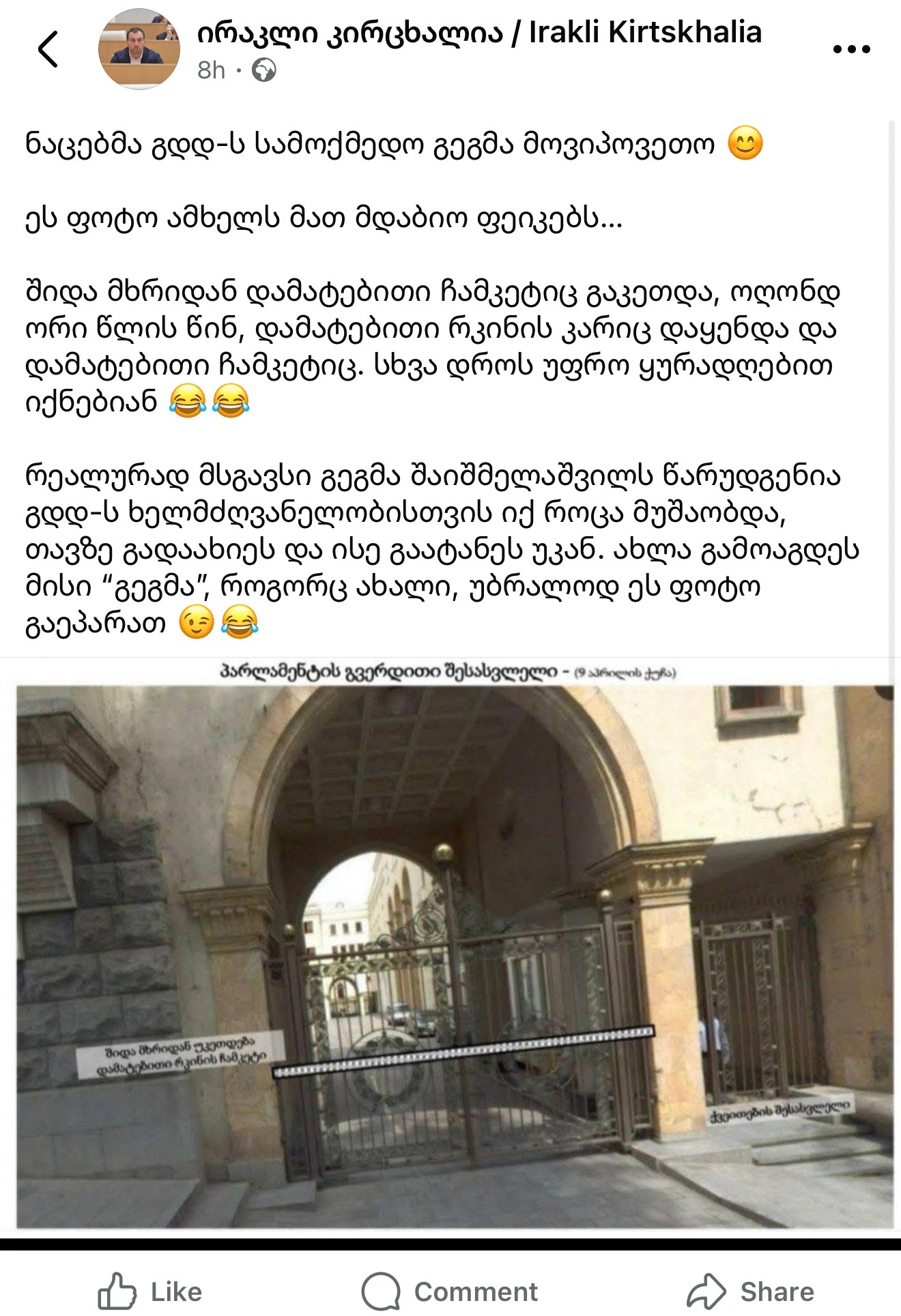 ირაკლი კირცხალია: “ნაცებმა” გდდ-ს სამოქმედო გეგმა მოვიპოვეთო, რეალურად, მსგავსი გეგმა შაიშმელაშვილს წარუდგენია ხელმძღვანელობისთვის გდდ-ში როცა მუშაობდა - ახლა გამოაგდეს მისი ,,გეგმა”, უბრალოდ, ფოტო გაეპარათ, რომელიც ამხელს მათ მდაბიო ,,ფეიკებს”