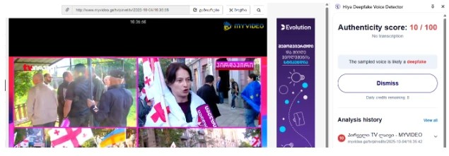 ასევე შევადარეთ “ტვ პირველის” სხვა კადრი.ამ შემთხვევაში ინტერვიუს ხმა Hiya-მ აღიქვა როგორც 90%-ით გაყალბებული: