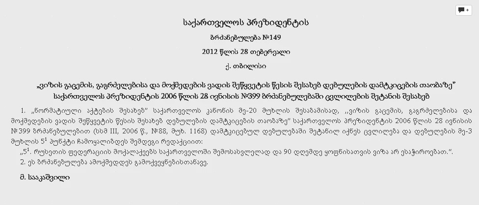 „რუსეთის ფედერაციის მოქალაქეებს საქართველოში შემოსასვლელად და 90 დღემდე ყოფნისათვის ვიზა არ ესაჭიროებათ. ეს ბრძანებულება ამოქმედდეს გამოქვეყნებისთანავე“.
