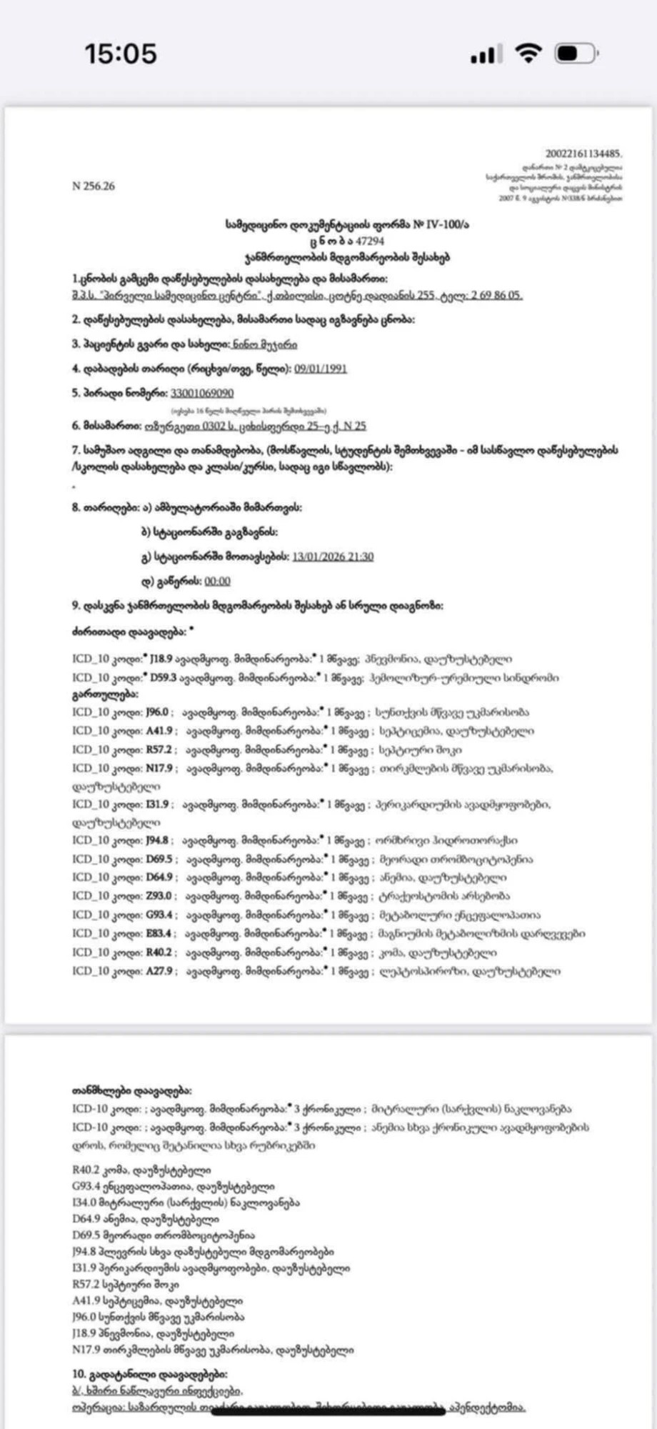 ფორმა ასი მოცულობით დიდია, სწორედ ამიტომ დავურთავ კლინიკაში მოთავსების დღეს არსებულ მდგომარეობას და ექიმის მიერ გაკეთებულ ყველაზე ბოლო ჩანაწერს.