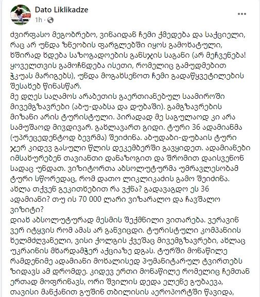 პირადად მე საგულაოდ კი არა სამუშაოდ მივდივარ. გახლავართ გიდი. ტური 36 ადამიანმა (უპრეცედენტოდ ბევრმა) შეიძინა. აბუდაბი-დუბაის ტური ჯერ კიდევ გასული წლის დეკემბერში გავყიდეთ. ადამიანები იმსახურებენ თავიანთი დანაზოგით და შრომით დაისვენონ სადაც უნდათ. ვიზიტორთა აბსოლუტურმა უმრავლესობამ ტური სწორედაც, რომ დათო ლიკლიკაძის გამო შეიძინა. ახლა თქვენ გეკითხებით რა ვქნა? გადავაგდო ეს 36 ადამიანი? თუ ის 70 000 ლარი ვიზარალო და ჩავშალო ვიზიტი?