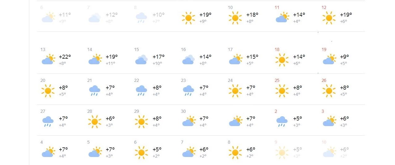 შემოდგომის ბოლო თვემ თავიდანვე თბილი ამინდებით გაგვანებივრა, თუმცა თუ ერთი თვის პროგნოზს გადავავლებთ თვალს, ვნახავთ, რომ ტემპერატურა თანდათან მცირდება და +5 გრადუსამდეც კი ჩამოდის. სასიხარულო კი ისაა, რომ მზიანი ამინდები მაინც ჭარბობს. მთელი თვის პროგნოზს ფოტოზე გადაავლეთ თვალი, უახლოესი დღეებისას კი ქვემოთ იხილავთ.