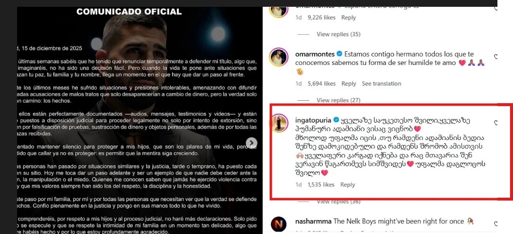 ცნობისთვის, ესპანურ მედიაში გავრცელებული ინფორმაციით, მისი მეუღლე, ჯორჯინა უზკატეგუი, ოფიციალურად ითხოვს განქორწინებას და ჩემპიონის ქონების ნახევარს.