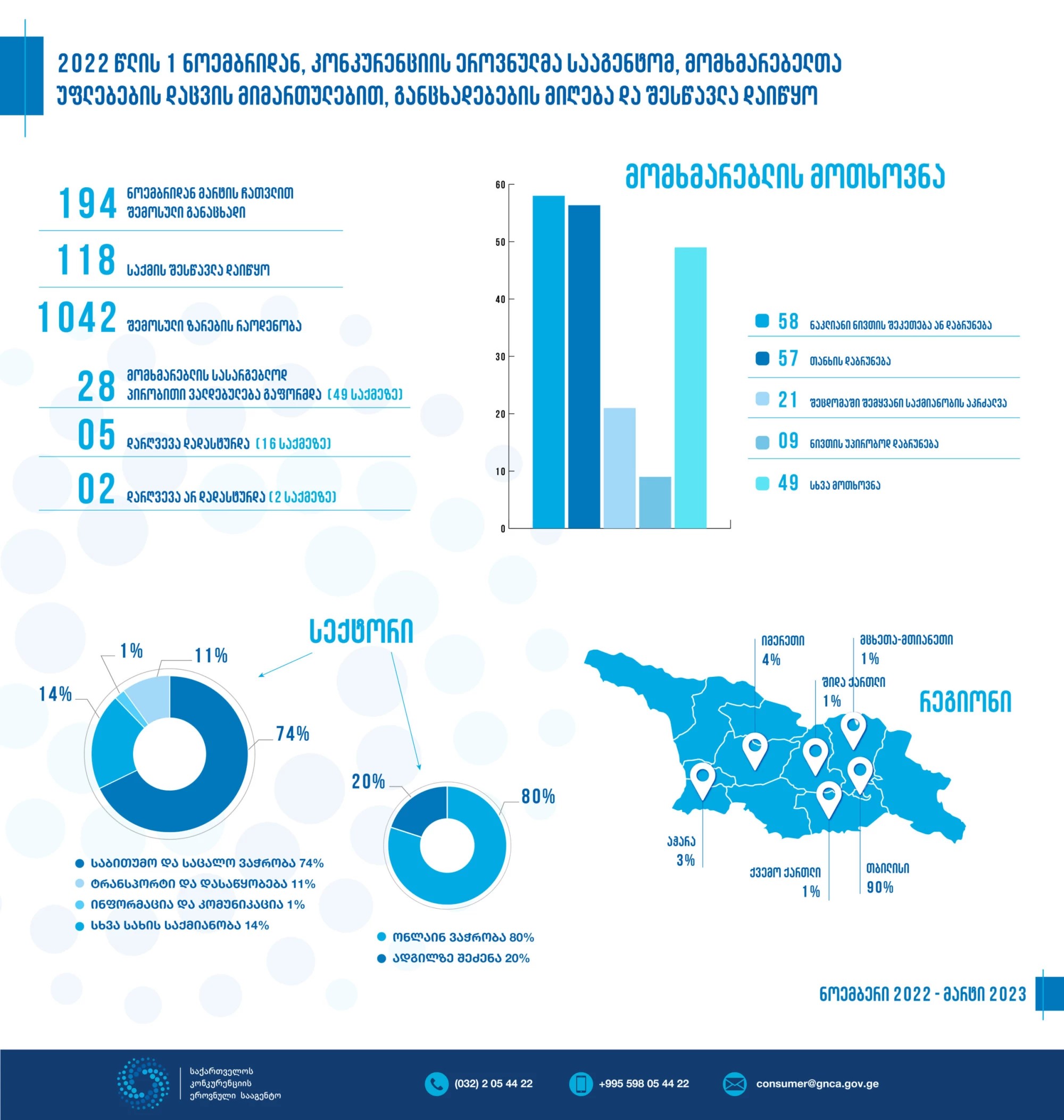 მომხმარებელთა უფლებების დაცვის მიმართულებით, 2022 წლის ნოემბრიდან – 2023 წლის მარტის ჩათვლით, კონკურენციის ეროვნულ სააგენტოში 194 განაცხადი დაფიქსირდა, საიდანაც, არსებული მდგომარეობით, 118 განცხადებაზე საქმის შესწავლა დაიწყო და აქედან 109 საქმე დასრულდა. ინფორმაციას კონკურენციის ეროვნული სააგენტო ავრცელებს.