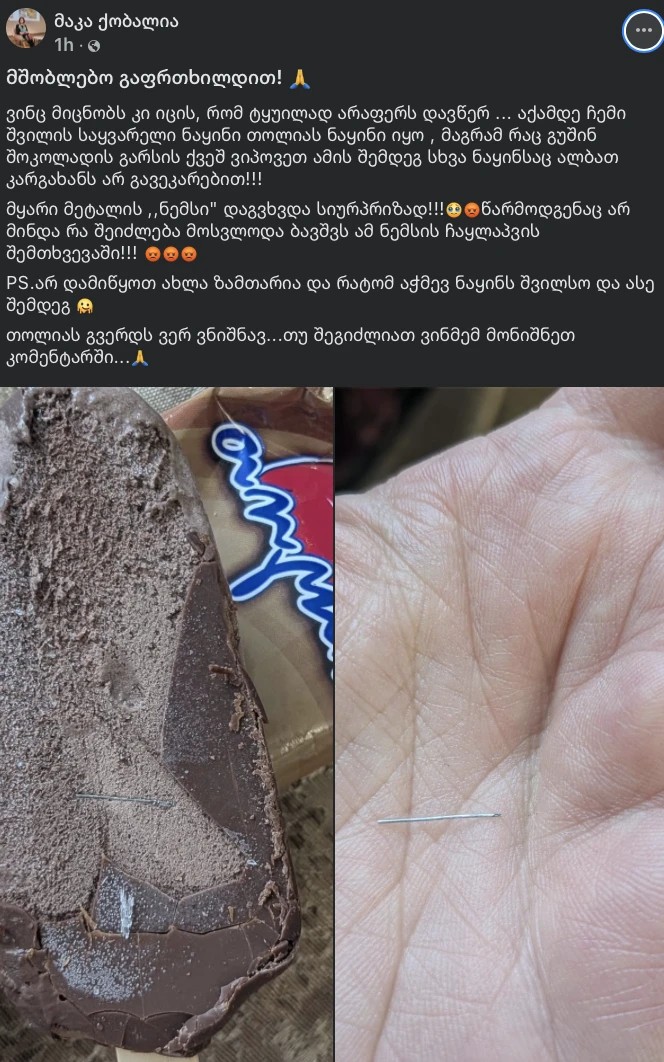„სასოწარკვეთილი მომხმარებლების ჯგუფში" სოციალური ქსელის ერთ-ერთი მომხმარებელი ნაყინში აღმოჩენილი მეტალის ნემსის შესახებ ინფორმაციას ავრცელებს და მშობლებს აფრთხილებს.