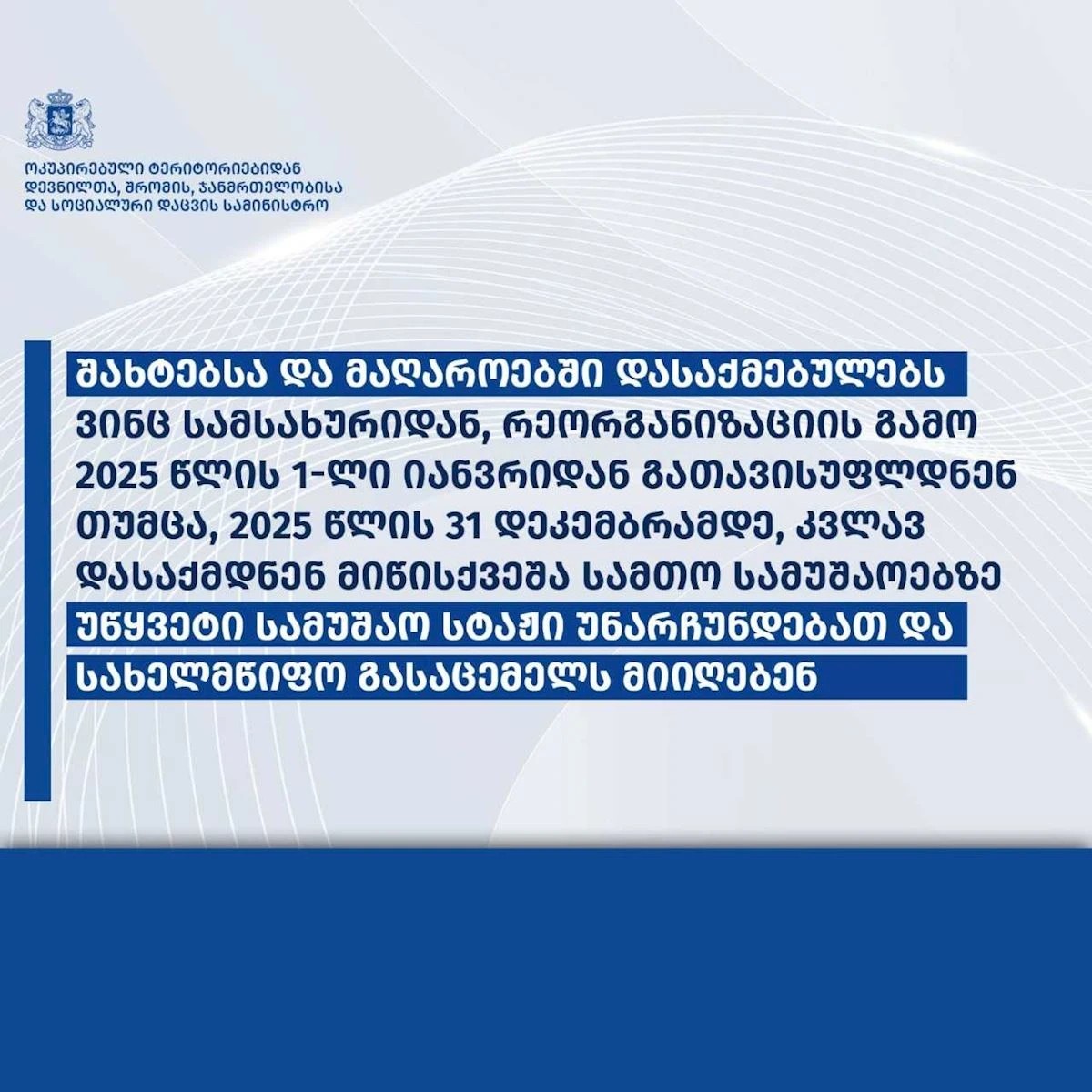 საქართველოს მთავრობის გადაწყვეტილებით, შახტებსა და მაღაროებში დასაქმებულებს, ვინც სამსახურიდან, რეორგანიზაციის გამო, 2025 წლის 1 იანვრიდან გათავისუფლდნენ, თუმცა 2025 წლის 31 დეკემბრამდე, კვლავ დასაქმდნენ მიწისქვეშა სამთო სამუშაოებზე, უწყვეტი სამუშაო სტაჟი უნარჩუნდებათ. შესაბამისად, საპენსიო ასაკამდე სახელმწიფო გასაცემელს მიიღებენ.