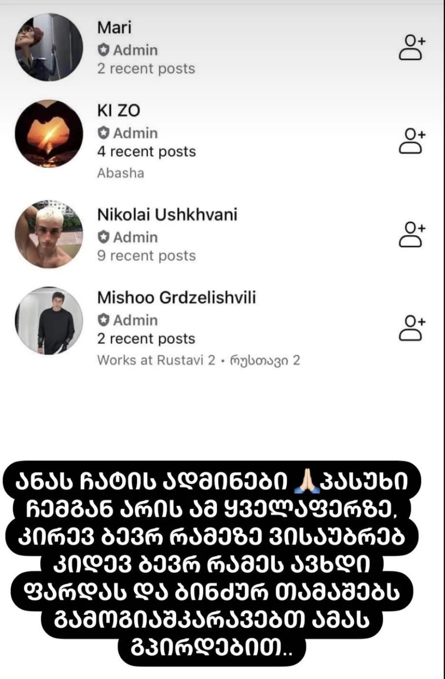 „ანას ჩატის ადმინები. ჩემგან პასუხი არის ამ ყველაფერზე... კიდევ ბევრ რამეზე ვისაუბრებ, კიდევ ბევრ რამეს ავხდი ფარდას და ბინძურ თამაშებს გამოგიაშკარავებთ, ამას გპირდებით,“ - წერს თაია და „სქრინს“ აქვეყნებს.