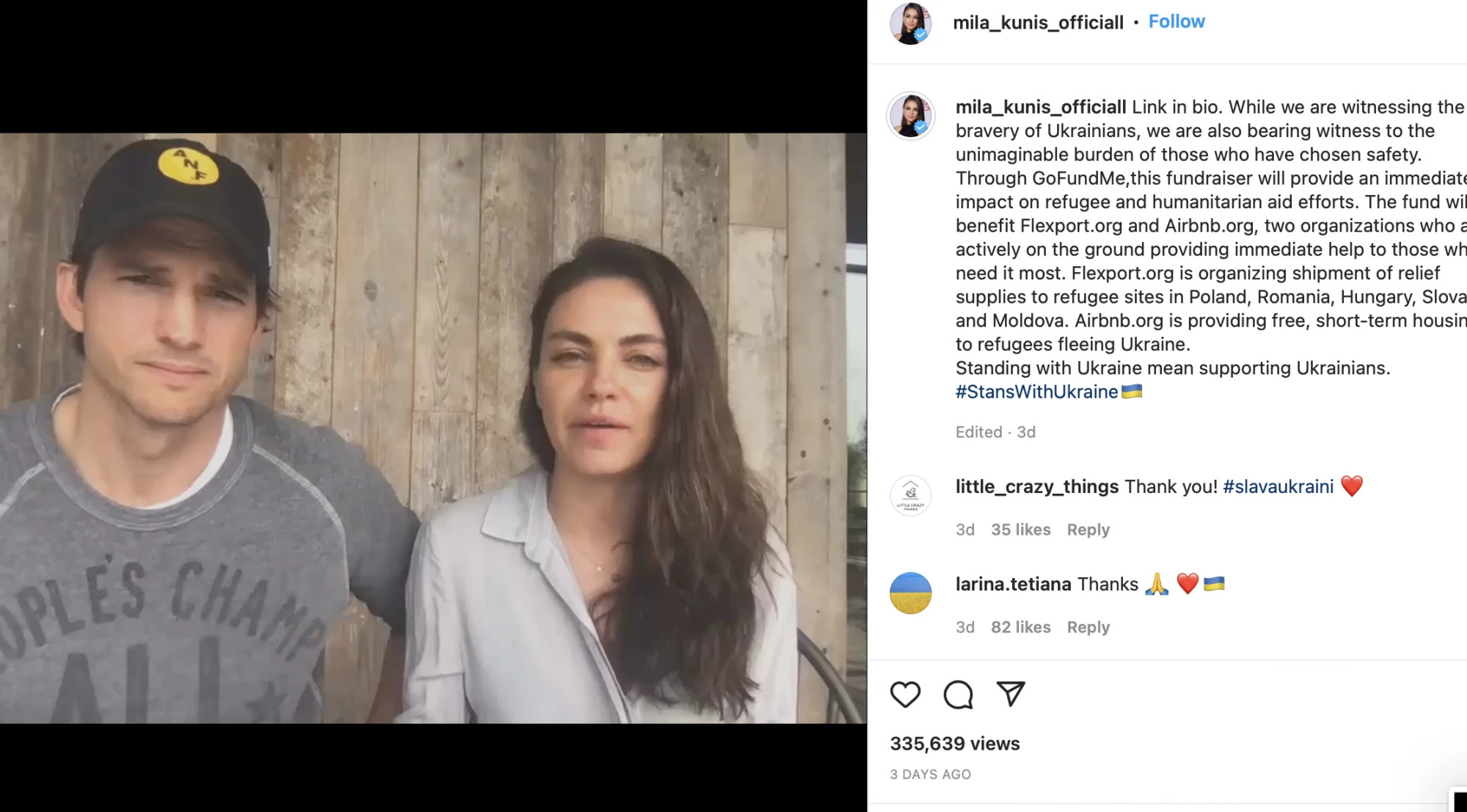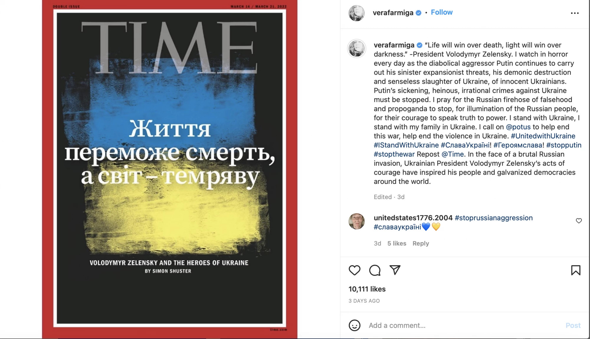 „ჩვენი მტერი ისევე გაქრება, როგორც ნამი მზის ამოსვლისას. მე ვდგავარ უკრაინის გვერდით, მე ვდგავარ ჩემი ოჯახის გვერდით“,- წერს ის სოციალურ ქსელში და საზოგადოებას უკრაინელი ხალხის დახმარებისგენ მოუწოდებს.