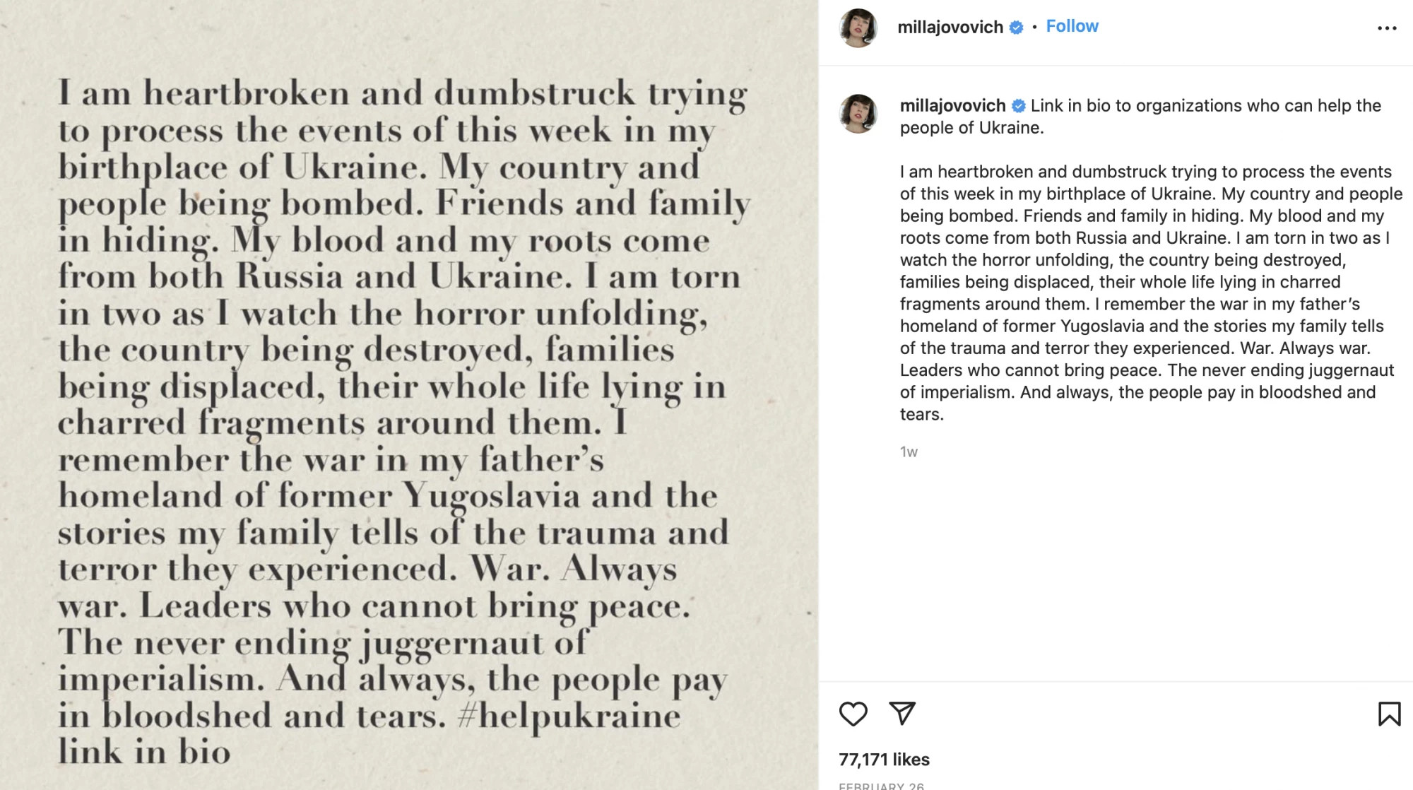 უკრაინაში განვითარებულ მოვლენებს გამოეხმაურა ცნობილი მსახიობი და მოდელი, მილა იოვოვიჩი, რომელიც წარმოშობით კიევიდანაა. უკრაინის მხარდამჭერი ემოციური პოსტი მან ინსტაგრამის პირად გვერდზე განათავსა: