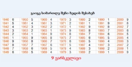 იმისათვის, რომ გაიგოთ როგორ მოიქცეთ მომავალში, რომ პირად ცხოვრებასა და კარიერაში წარმატებას მიაღწიოთ, ცხრილში მოძებნეთ თქვენი დაბადების წელი და მისი შესაბამისი რიცხვი და გაიგეთ თქვენი ბედის რიცხვი.