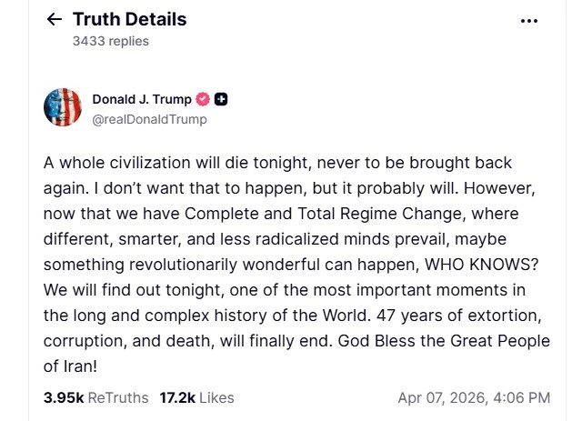 მისი თქმით, თუ დარჩენილ დროში ირანთან გარიგების დადება ვერ მოხერხდება, „ამაღამ დაიღუპება მთელი ცივილიზაცია“.