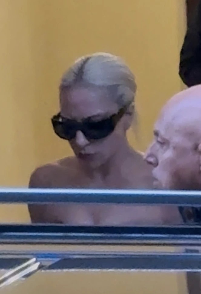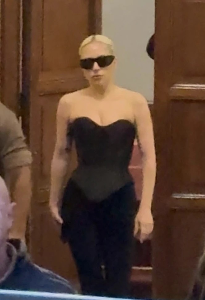გადასაღებ მოედანზე ლედი გაგას შავი ფერის ზედა და მუქი ფერის შარვალი ეცვა.