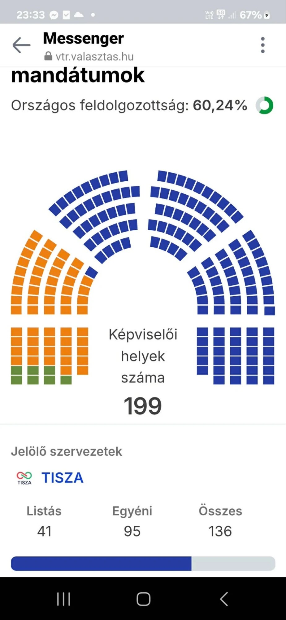 ცნობისთვის, უნგრეთის საპარლამენტო არჩევნებში, ხმების 60 %-ის დათვლის შემდეგ, პარტია „ტისა“ ლიდერობს. ამ მონაცემების თანახმად, „ტისა“ 199-ადგილიან პარლამენტში 136 მანდატს მიიღებს.