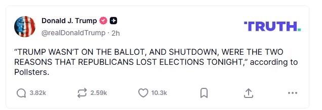„საარჩევნო ბიულეტენზე არ იყო დონალდ ტრამპი და „შათდაუნი“, ეს ის ორი მიზეზია, რატომაც რესპუბლიკელებმა არჩევნები წააგეს“, – წერს დონალდ ტრამპი სოციალურ ქსელშიგამოქვეყნებულ პოსტში.