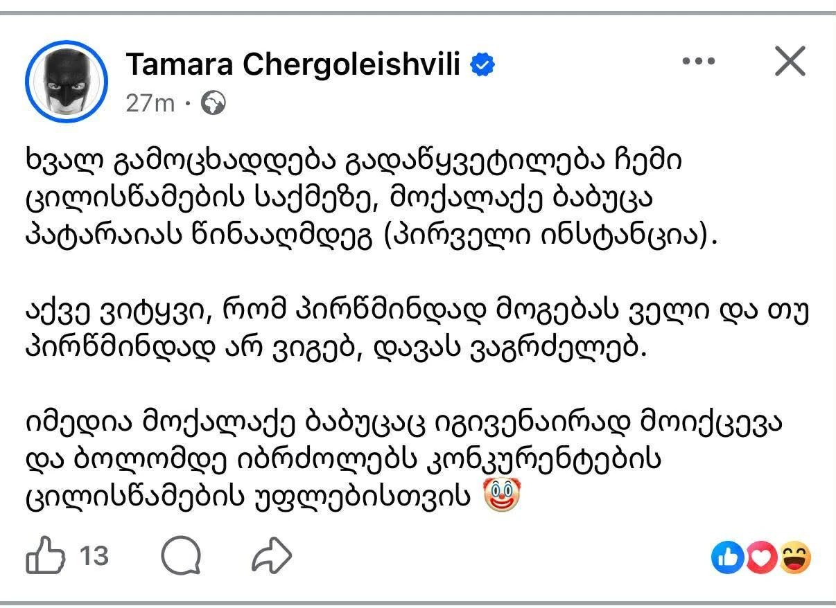 პირწმინდად, გამარჯვების მოლოდინი მაქვს და თუ არ ვიმარჯვებ, დავას ვაგრძელებ სტრასბურგამდე. იმედი მაქვს, რომ ბაია პატარაიაც იმავენაირად მოიქცევა, - ამის შესახებ პარტია „ფედერალისტების“ ლიდერი თამარ ჩერგოლეიშვილი „პრაიმტაიმთან“ ,10 დეკემბერს ჩანიშნულ სასამართლოსთან დაკავშირებით, აცხადებს.