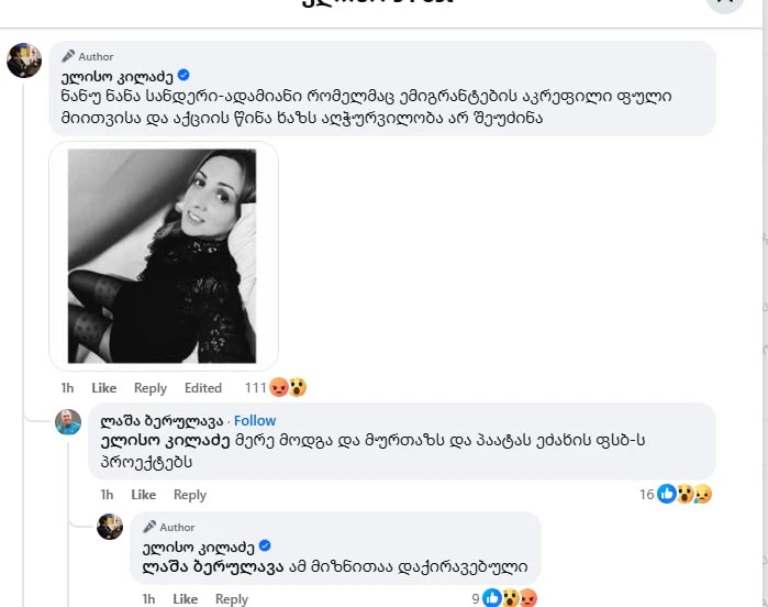 "სად წავიდა ემიგრანტების 15 000€, რომელიც ერთ-ერთ ემიგრანტს ჩაბარდა აღჭურვილობის შესაძენად?!" - წერს ელისო კილაძე სოციალურ ქსელში და მისივე პოსტის ერთ-ერთ კომენტარში, ერთი-ერთი აქტივისტის ნანა სანდერის ფოტოს აქვეყნებს ტექსტით: "ნანუ ნანა სანდერი - ადამიანი, რომელმაც ემიგრანტების აკრეფილი ფული მიითვისა და აქციის წინა ხაზს აღჭურვილობა არ შეუძინა".