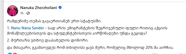 "სად არის ემიგრანტების შეგროვებული ფული, რითიც აქციის მონაწილეებისთვის და სტუდენტებისთვის აირწინაღები უნდა გეყიდა?" - ამ კითხვით ნანუკა ჟორჟოლიანი ერთ-ერთ აქტივისტს, ნანა სანდერს მიმართავს, რომელიც როგორც თავად წერს, აქციის მონაწილეებისთვის სხვადასხვა აღჭურვილობის ყიდვით და მომარაგებით იყო დაკავებული.