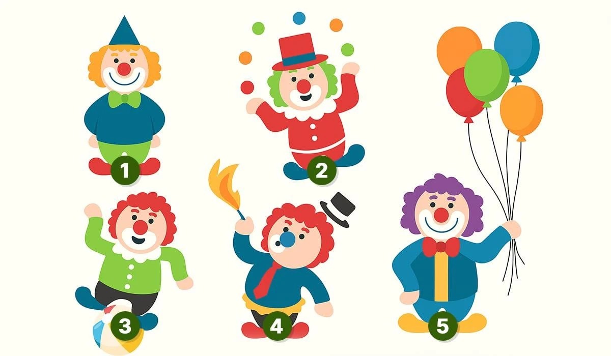 სურათზე ნაჩვენებია ხუთი ჯამბაზი, რომლებიც სხვადასხვა ხრიკს აკეთებენ. აირჩიეთ ერთი მათგანი, რომელიც თქვენთან ყველაზე ახლოსაა.