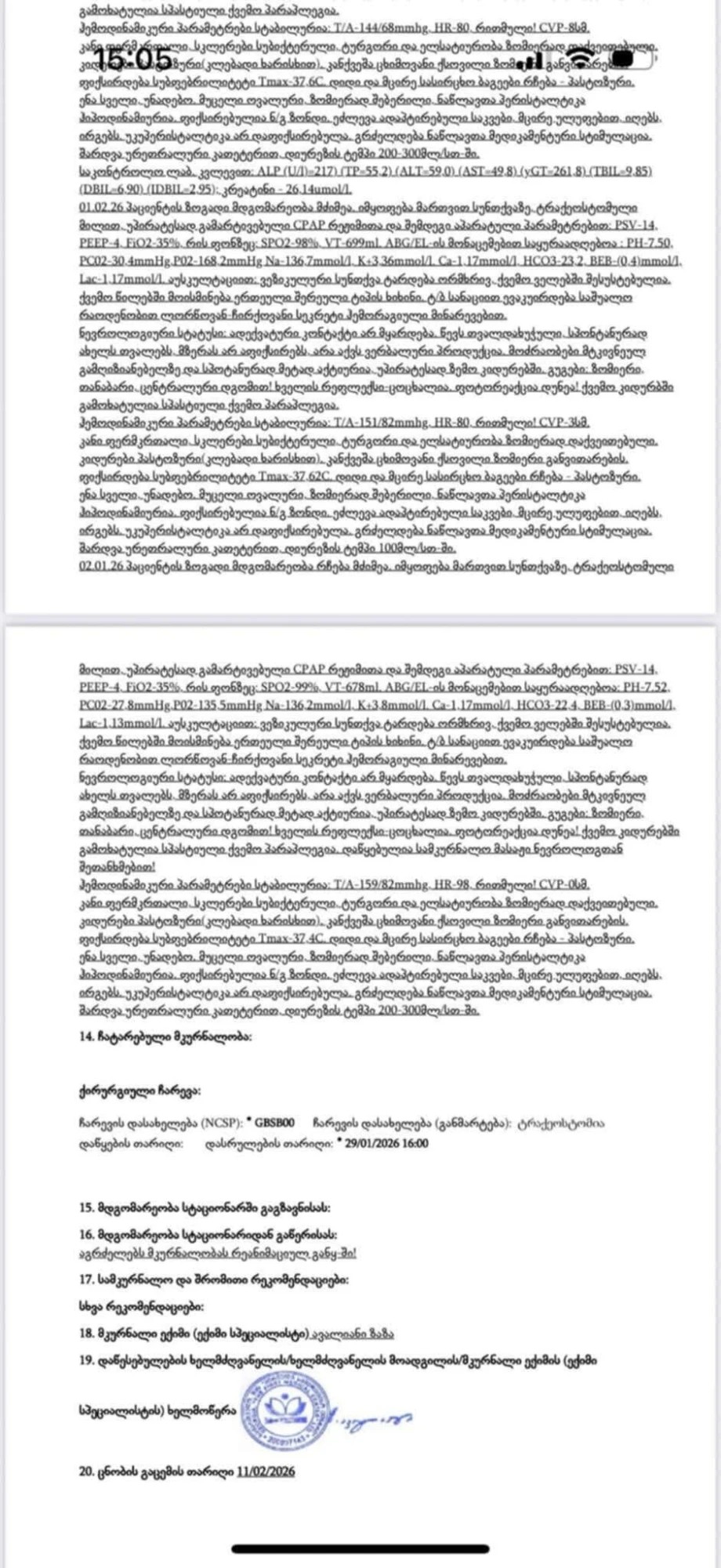 ფორმა ასი მოცულობით დიდია, სწორედ ამიტომ დავურთავ კლინიკაში მოთავსების დღეს არსებულ მდგომარეობას და ექიმის მიერ გაკეთებულ ყველაზე ბოლო ჩანაწერს.