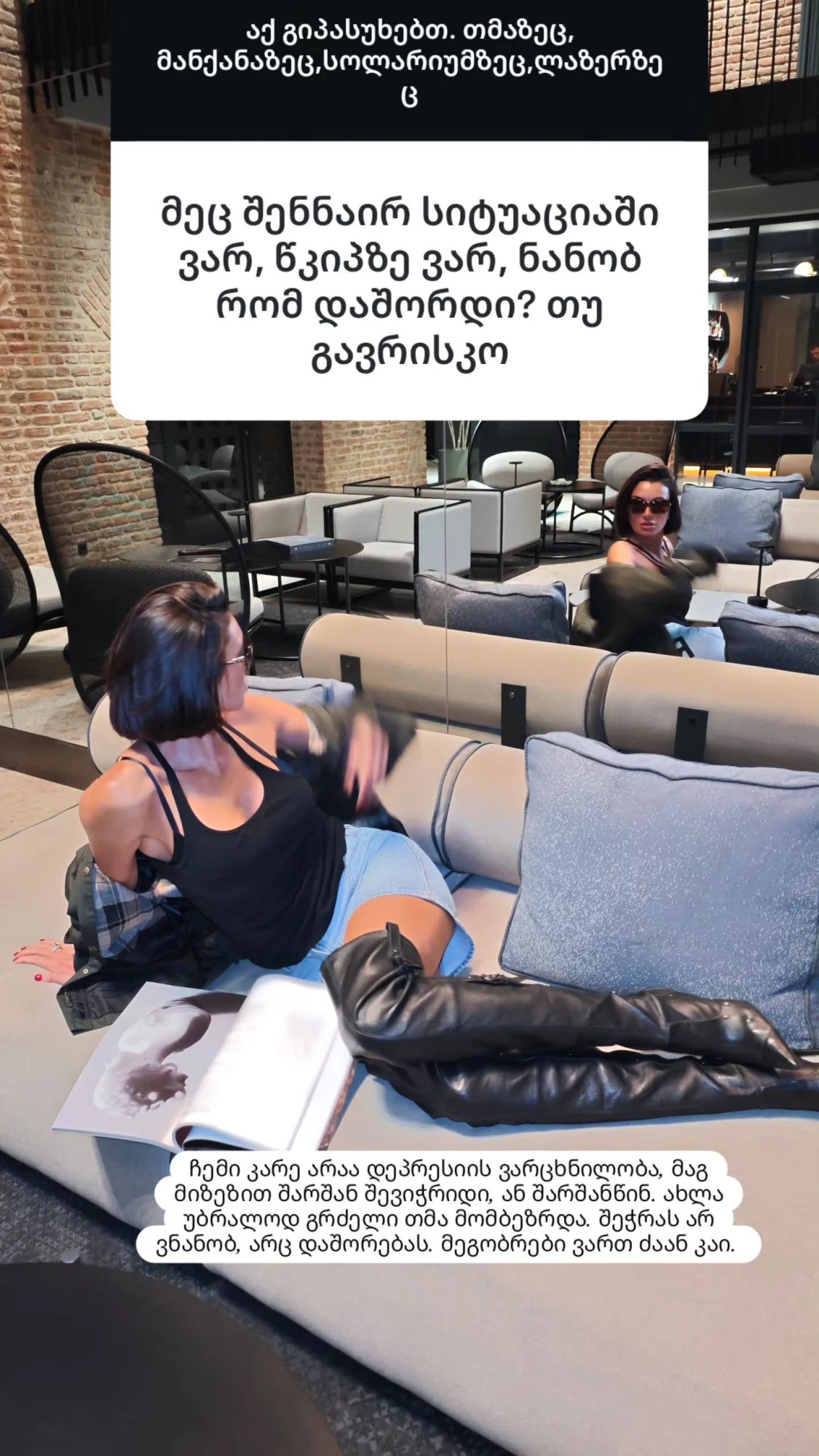 ,,ჩემი კარე არ არის დეპრესიის ვარცხნილობა. ამ მიზეზით შარშან შევიჭრიდი, ან შარშანწინ. ახლა უბრალოდ გრძელი თმა მომბეზრდა. არც შეჭრას ვნანობ, არც - დაშორებას . კარგი მეგობრები ვართ".