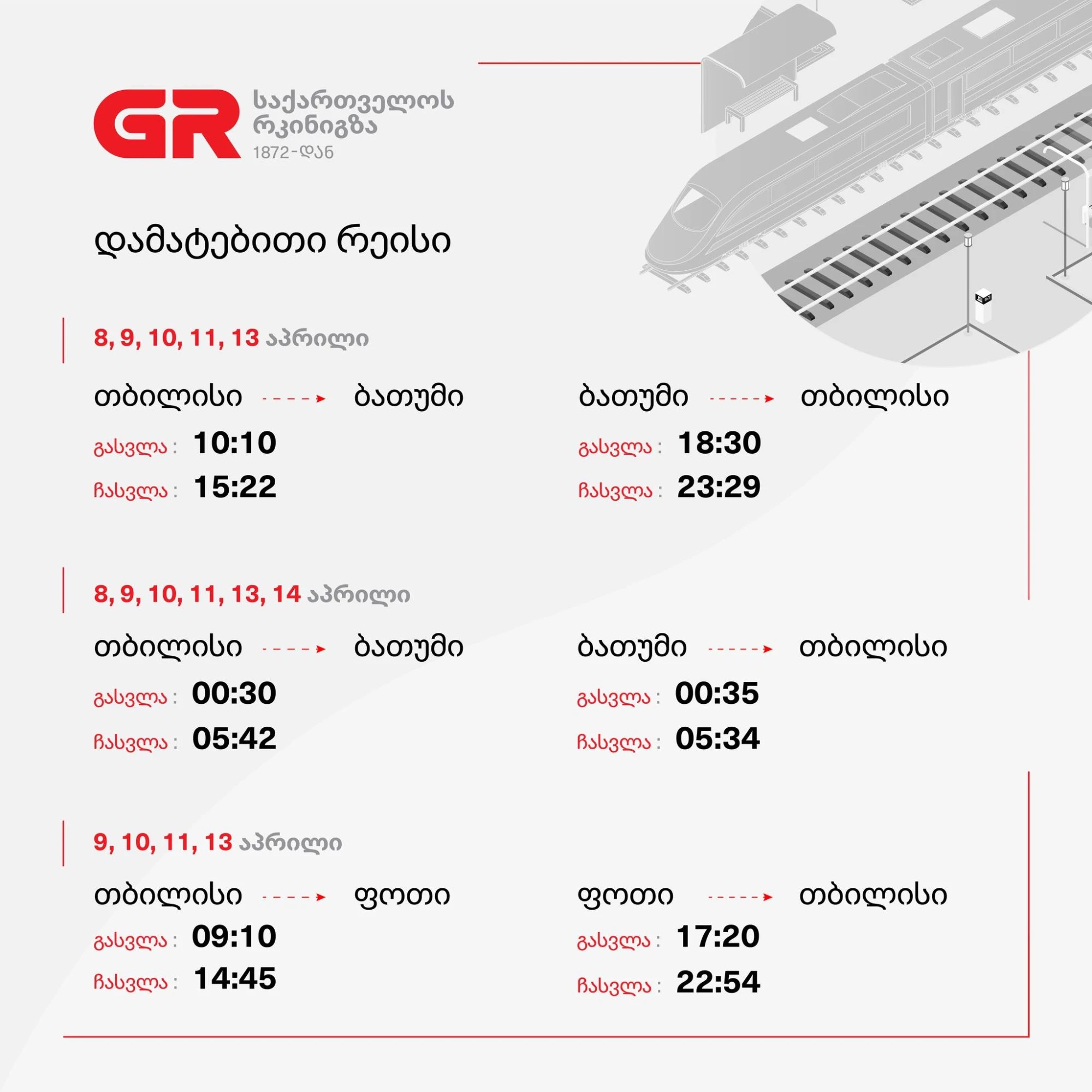 საქართველოს რკინიგზამ, აღდგომის დღესასწაულთან დაკავშირებით გაზრდილი მგზავრთა ნაკადის გამო, დამატებითი რეისები დანიშნა. რეისები შესრულდება თბილისი - ბათუმი - თბილისი და თბილისი - ფოთი - თბილისის მიმართულებით, 14 აპრილამდე.