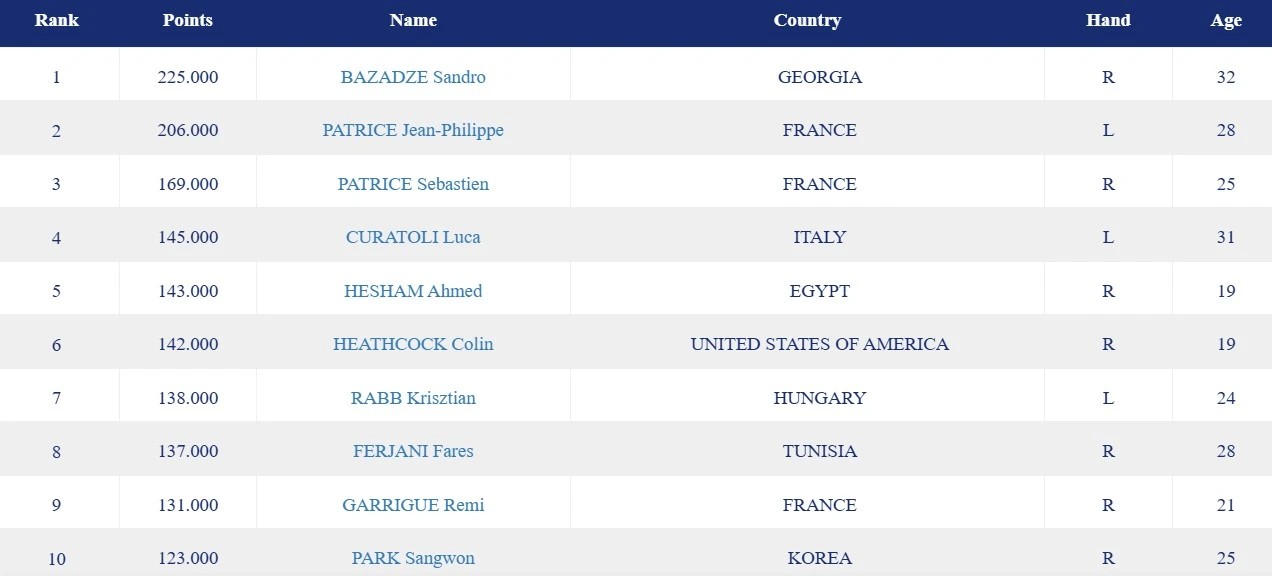 განახლებულ მსოფლიო რეიტინგში მეორე ადგილს სწორედ პატრისი იკავებს 206 ქულით. კლასიფიკაციაში მესამეა (169 ქულით) ასევე ფრანგი სებასტიან პატრისი, მეოთხეზე იტალიელი ლუკა კურატოლია (145 ქულა), ხოლო მეხუთეზე – ეგვიპტელი აჰმედ ჰეშამი (143 ქულა).