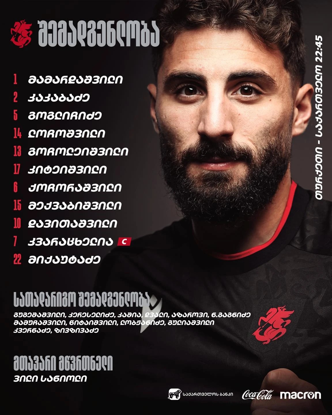 შეხვედრის წინ ჩვენი გუნდის მთავარმა მწვრთნელმა ვილი სანიოლმა სასტარტო თერთმეტეული გამოაქვეყნა.